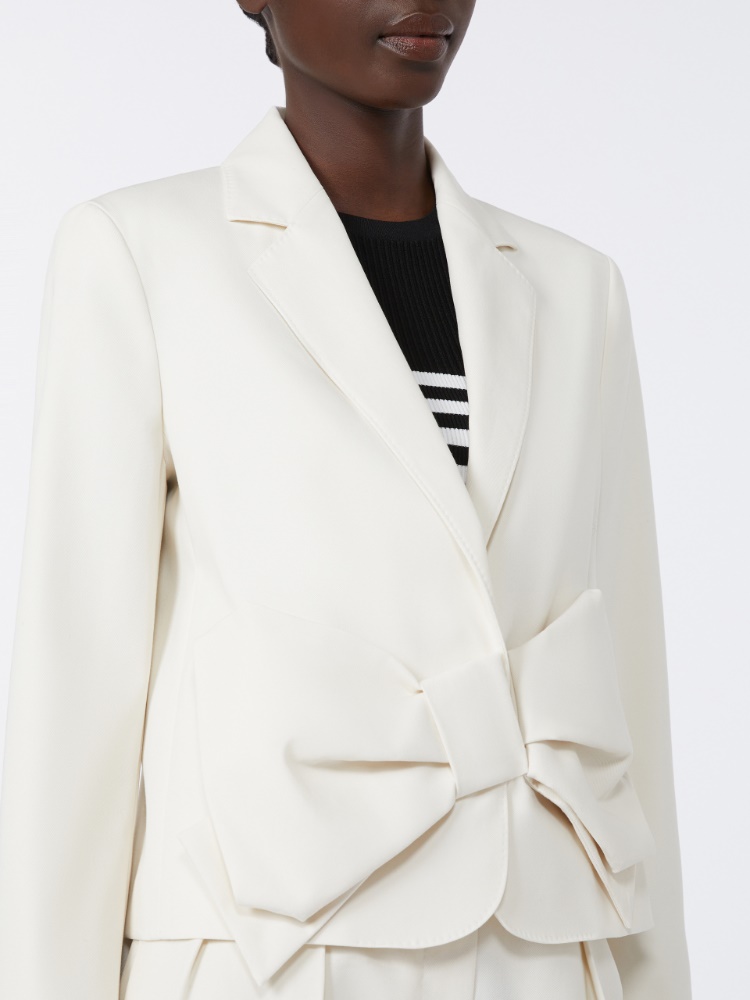 Couture-inspired short jacket featuring a maxi bow appliqué on the front.